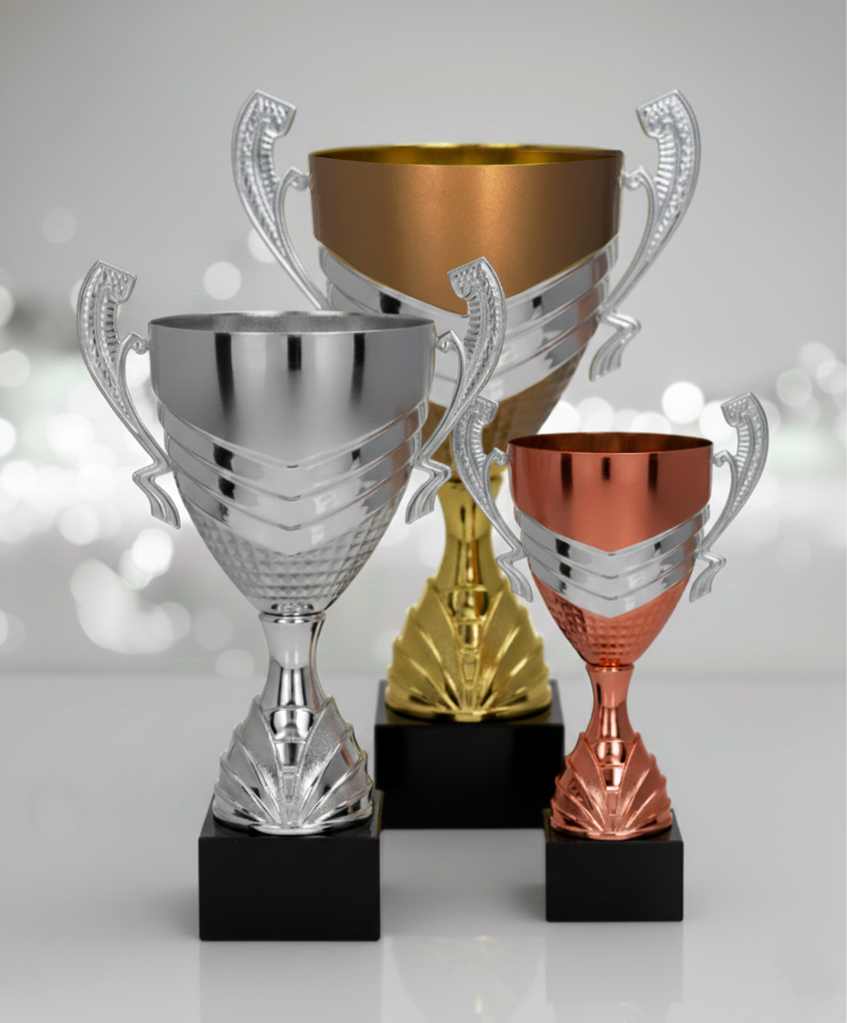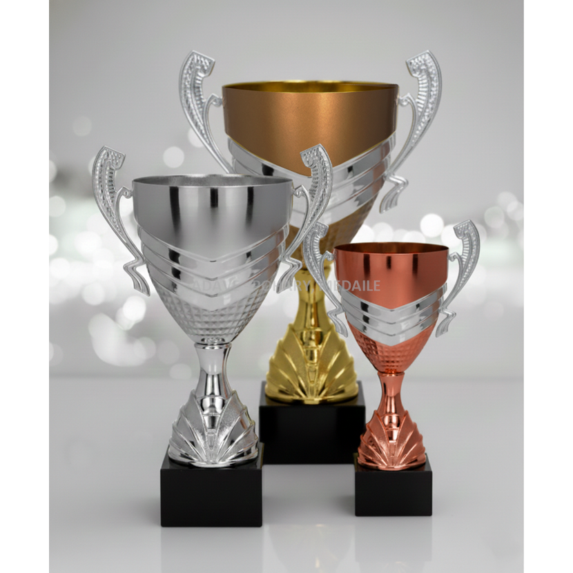 Barva : zlato, stříbro, bronz. Velikosti pohárů 42,38,34cm. K poháru si můžete objednat štítek s vlastním textem nebo logem. Na korpus lze umístit pokličku se soškou.